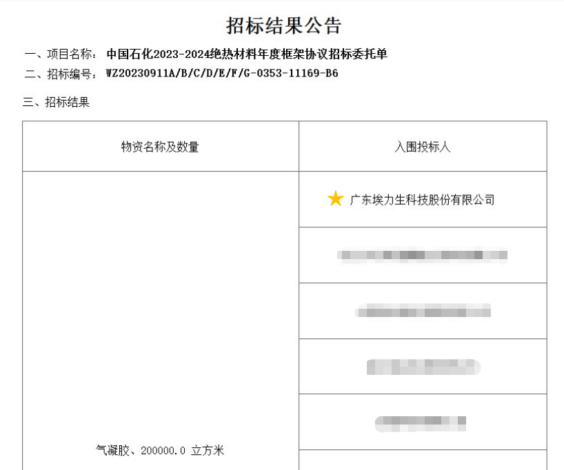 2023年9月18日,中國石化國際事業(yè)有限公司公告中國石化2023-2024絕熱材料年度框架協(xié)議中標企業(yè)。埃力生以綜合得分第一名入圍氣凝膠供應商。2018年至今,中石化共開(kāi)展六輪年度氣凝膠集采招標,埃力生連續六年入圍,五年排名第一。