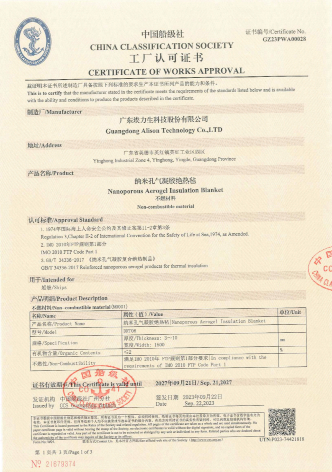 2023年9月23日,中國船級社向埃力生簽發(fā)了《工廠(chǎng)認可證書(shū)》。該證書(shū)根據《1974年國際海上人命安全公約及其修正案》第Ⅱ-2章第3條、《IMO 2010年FTP規則》第1部分、GB/T 34336-2017《納米孔氣凝膠復合絕熱制品》等標準進(jìn)行檢驗,認可埃力生納米孔氣凝膠絕熱氈產(chǎn)品作為不燃材料,可用于船舶。