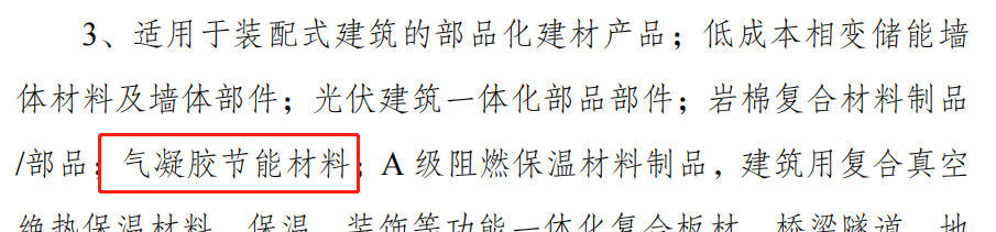 氣凝膠及其相關(guān)制品作為納米級的防火防水隔熱制品,在2018年11月7日進(jìn)入《戰略性新興產(chǎn)業(yè)分類(lèi)(2018)》——新型建筑材料——隔熱和隔音材料分類(lèi),2019年10月30日進(jìn)入《產(chǎn)業(yè)結構調整指導目錄(2019年本)》,氣凝膠節能材料進(jìn)入“鼓勵類(lèi)”建材分類(lèi)。
